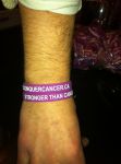 Second bracelet is white on purple and says " STRONGER THEN CANCER" with www.conquercancer.ca on the other side