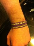 First bracelets is yellow on purple and says "CANCER SUCKS!!" with www.conquercancer.ca on the other side